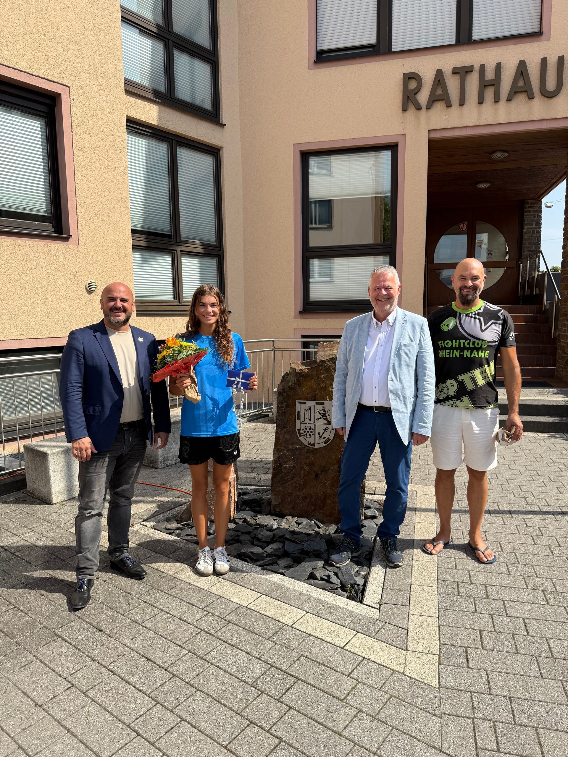 Auf Initiative unseres Ortsbürgermeisters Herrn Dietz wurde unsere erfolgreiche Sportlerin Theresa am 14. August 2025 ins Rathaus der Verbandsgemeinde Rhein-Nahe eingeladen. Dort empfing sie Verbandsbürgermeister Herrn Seemann, um ihr zu den herausragenden sportlichen Erfolgen der letzten Zeit zu gratulieren.