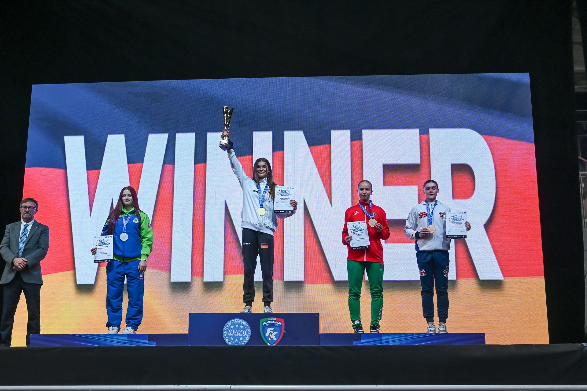 Vom 12. bis 21. September 2025 fand in Lido di Jesolo (Italien) die WAKO Youth European Championships 2025 statt. Mit 1.849 Athletinnen und Athleten aus 41 Nationen und insgesamt 2.396 Nennungen war die EM das größte Nachwuchsturnier des Jahres. Das Team Deutschland war mit 51 Sportlerinnen und Sportlern, fünf Trainern, einer Trainerin sowie einer Physiotherapeutin vertreten. Durch die Möglichkeit, erstmals in zwei Disziplinen zu starten, kam die deutsche Mannschaft auf insgesamt 67 Nennungen. Unsere Kämpferin Theresa Pekrul hatte sich durch ihre herausragenden Erfolge auf nationaler und internationaler Ebene sowohl im Pointfight als auch im Leichtkontakt für die EM qualifiziert. Einzug mit der deutschen Flagge Bereits die Eröffnungszeremonie am 21. September war ein Höhepunkt: Theresa erhielt die große Ehre, die deutsche Flagge für das Nationalteam in die Halle zu tragen – ein Gänsehautmoment für alle Beteiligten. Starker Turnierstart Nach bestandener Waage begann für Theresa am 22. September das Turnier. Aufgrund ihres ersten Platzes in der Weltrangliste erhielt sie ein Freilos, musste aber direkt am ersten Tag gegen die erfahrene Irin Sarah Hanratty antreten – ehemalige Welt- und Europameisterin bei den Older Cadets. Trotz Nervosität setzte sich Theresa souverän mit technischer Überlegenheit in der ersten Runde durch. Am folgenden Tag gewann sie im Leichtkontakt gegen Greta Roggi (Italien) durch technisches K.O.. Auch am Mittwoch blieb Theresa unaufhaltsam: Vormittags siegte sie im Pointfight gegen Ines Catic (Bosnien & Herzegowina) durch technisches K.O., nachmittags kämpfte sie sich in einem spannenden Duell über drei Runden gegen Tadeja Susec (Slowenien) zum 2:1-Sieg. Am Donnerstag wartete mit Zsofia Csenge Kiss (Ungarn) eine starke Gegnerin mit einer beeindruckenden Bilanz von über 83 % gewonnenen Kämpfen. Doch Theresa ließ nichts anbrennen und gewann souverän mit 3:0 im Leichtkontakt. Am Nachmittag traf sie im Pointfight erneut auf Kiss – und wieder hatte ihre Gegnerin keine Chance. Das Ergebnis: Sieg durch technisches K.O. Spannende Finalkämpfe Der Freitag wurde zum großen Finaltag. Im Leichtkontakt traf Theresa auf Ana Jan (Slowenien). Nach einem kräfteraubenden Duell über drei Runden setzte sie sich knapp, aber verdient, mit 2:1 durch und sicherte sich die Goldmedaille. Im anschließenden Pointfight-Finale traf sie auf Silia Memmou (Griechenland), die Tochter des griechischen Nationaltrainers. Nach einem intensiven Schlagabtausch ging der Kampf in die Verlängerung. Dort musste Theresa sich hauchdünn mit nur einem Punkt geschlagen geben. Die Enttäuschung war groß – hatte sie doch beide Titel anvisiert. Doch bei der Siegerehrung überwogen Stolz und Freude: Theresa stand ganz oben auf dem Podest, nahm die Goldmedaille im Leichtkontakt entgegen, während die deutsche Nationalhymne erklang und das Team lautstark jubelte. Dazu kam die Silbermedaille im Pointfight. Abschluss mit Team-Bronze Am Samstag folgten noch die Teamkämpfe im Pointfight. Auch hier setzte das Trainerteam auf Theresa. Gemeinsam mit dem deutschen Team erkämpfte sie sich die Bronzemedaille. Ein starker Abschluss als Juniorin Mit Gold, Silber und Bronze verabschiedete sich Theresa eindrucksvoll von der Juniorenklasse. Ab sofort startet sie in der Elitegruppe der Erwachsenen – und wir sind überzeugt, dass sie auch dort an ihre beeindruckenden Erfolge anknüpfen wird. Der SportClub Rhein-Nahe e.V. ist stolz auf Theresa und gratuliert herzlich zu dieser herausragenden Leistung bei der Europameisterschaft!