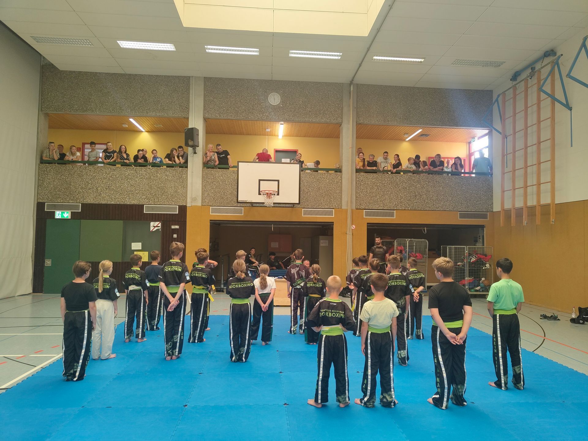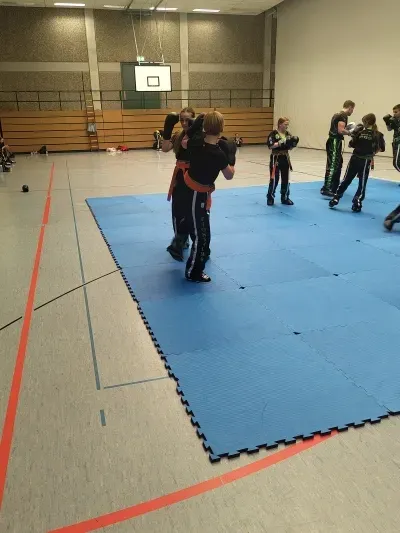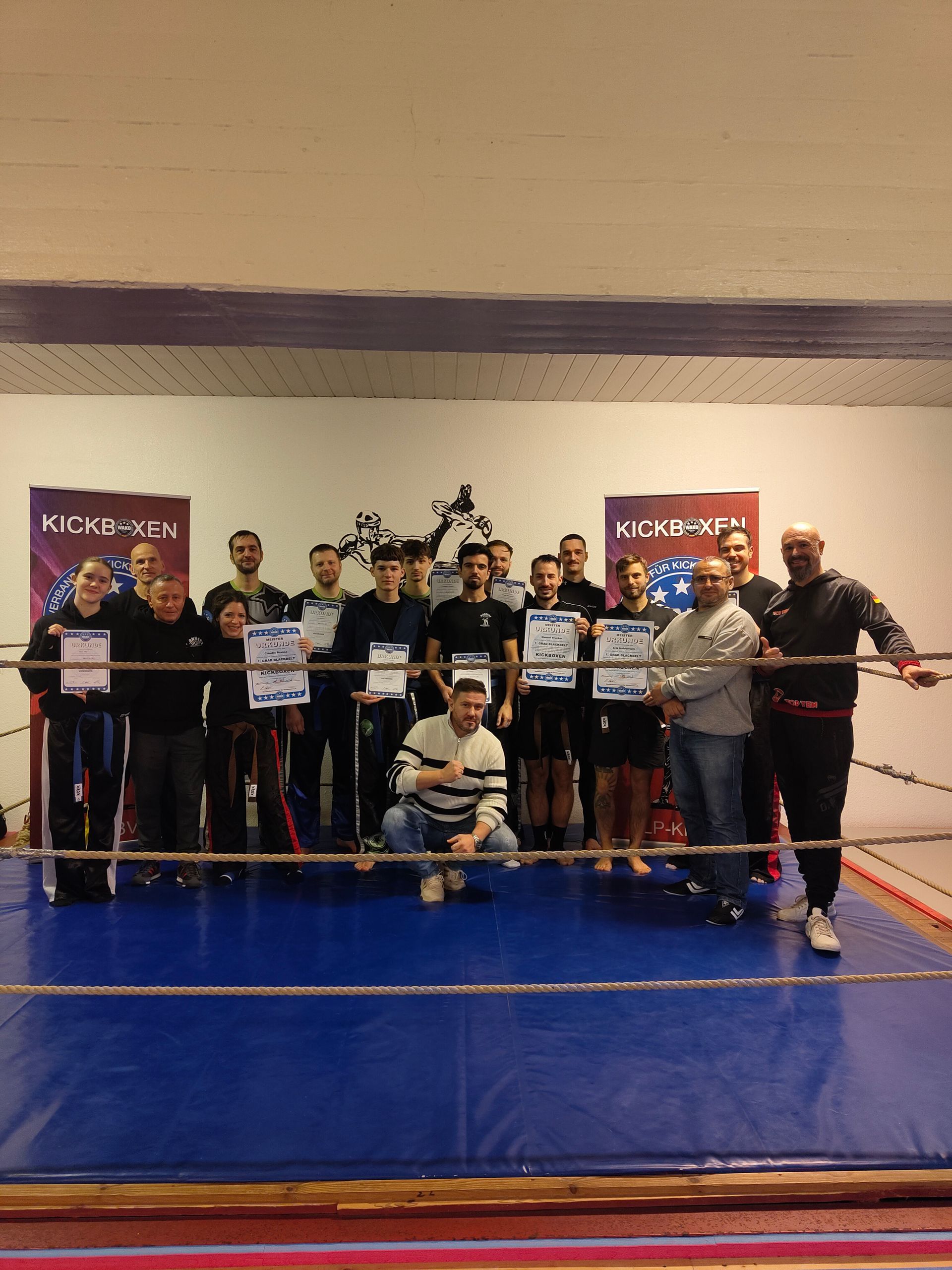 Am 12.12.2025 feierten unsere Kampfteens und Kickboxer ihren Jahresabschluss in gemütlicher Atmosphäre im Vorraum der Gemeindehalle Lalo. Dank eines vielfältigen Buffets und vieler helfender Hände war für jeden Geschmack etwas dabei – jeder Einzelne trug zum Gelingen dieses schönen Abends bei. Ein besonderer Höhepunkt war die Ehrung unserer erfolgreichen Athleten: Theresa, Europameisterin der WAKO, und Luca, Weltmeister der WKU, wurden für ihre herausragenden sportlichen Leistungen vom 1. Vorsitzenden mit einem besonderen T-Shirt ausgezeichnet. Auch im Bereich der Graduierungen gab es Grund zur Freude: Nils, Lennart, Constantin und Mergim wurden mit ihrem frisch erworbenen braunen Gürtel überrascht. Daniel erhielt feierlich von Dirk seinen 1. DAN (schwarzer Gürtel) mit persönlicher Namensbestickung überreicht. Für viel Gelächter sorgte der unerwartete Besuch des Weihnachtsmannes und seines Gehilfen Knecht Ruprecht. Mit humorvollen Anekdoten über jeden Anwesenden und dem gelegentlichen Einsatz der Rute wurde die Feier auf besonders unterhaltsame Weise bereichert. Es war ein rundum gelungenes Fest, und alle Teilnehmer gingen glücklich, zufrieden und mit vielen schönen Erinnerungen nach Hause.