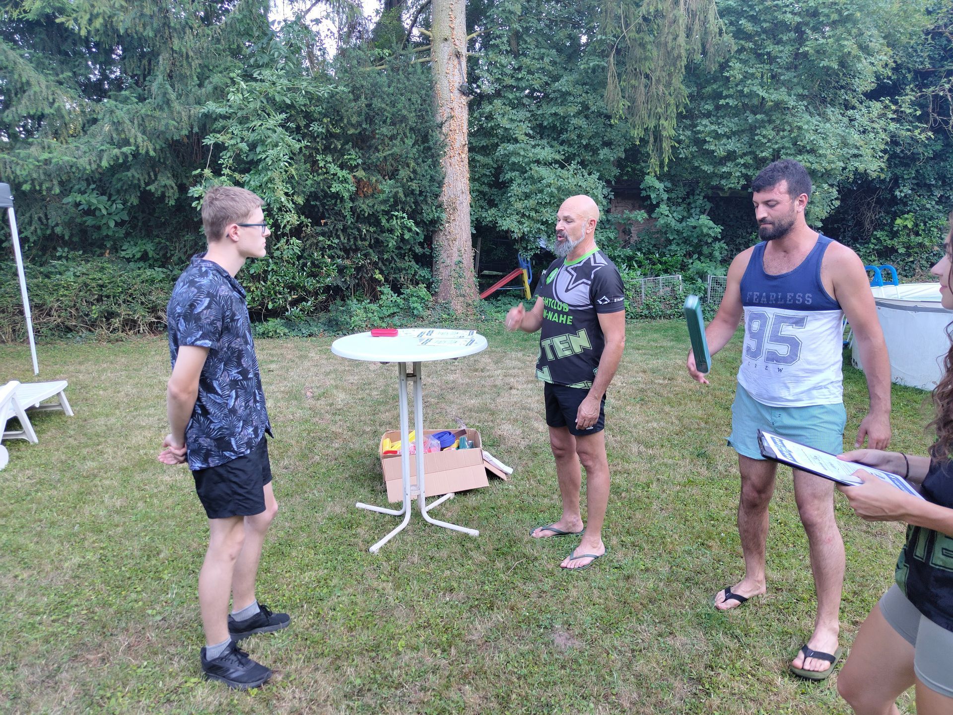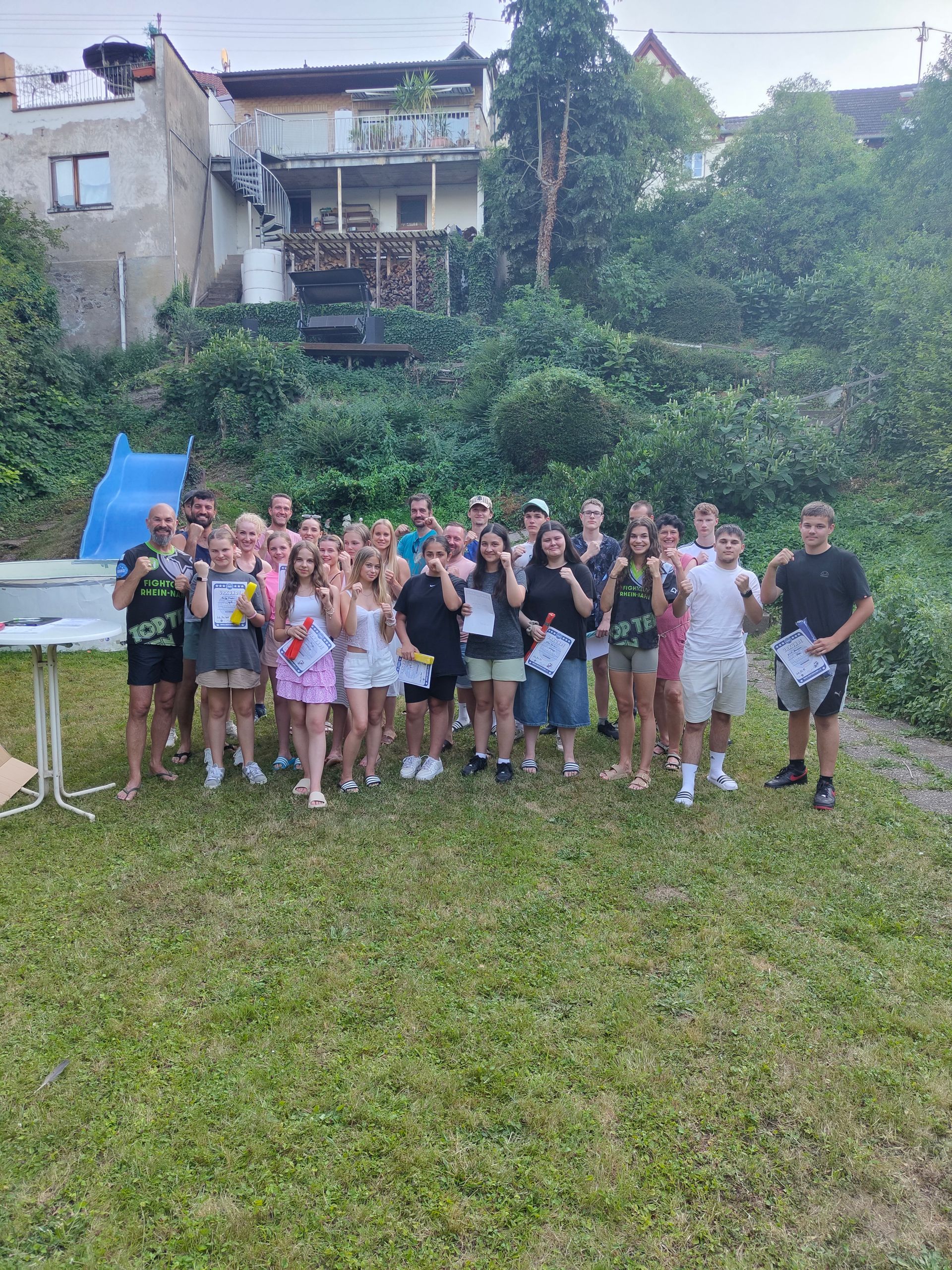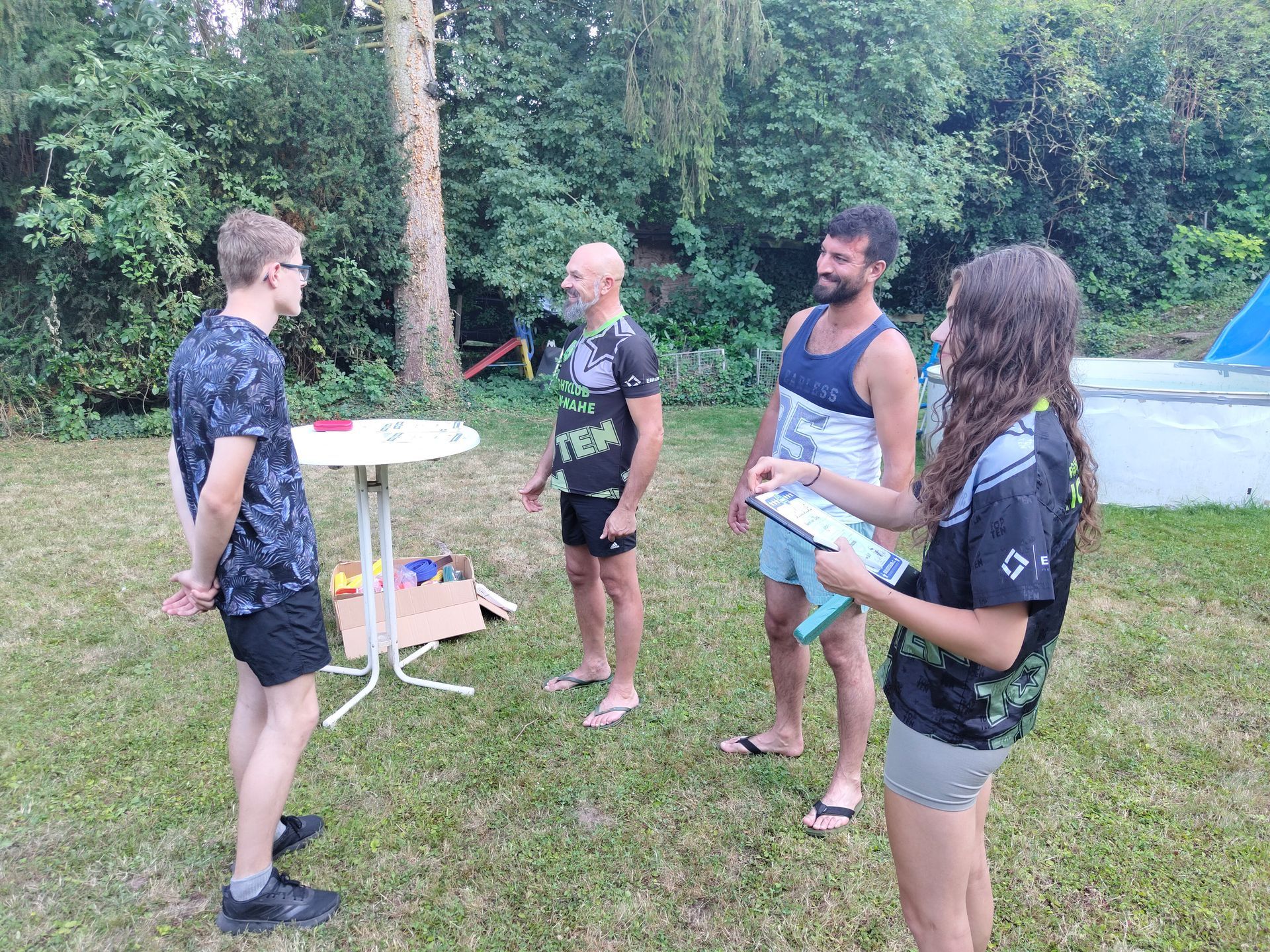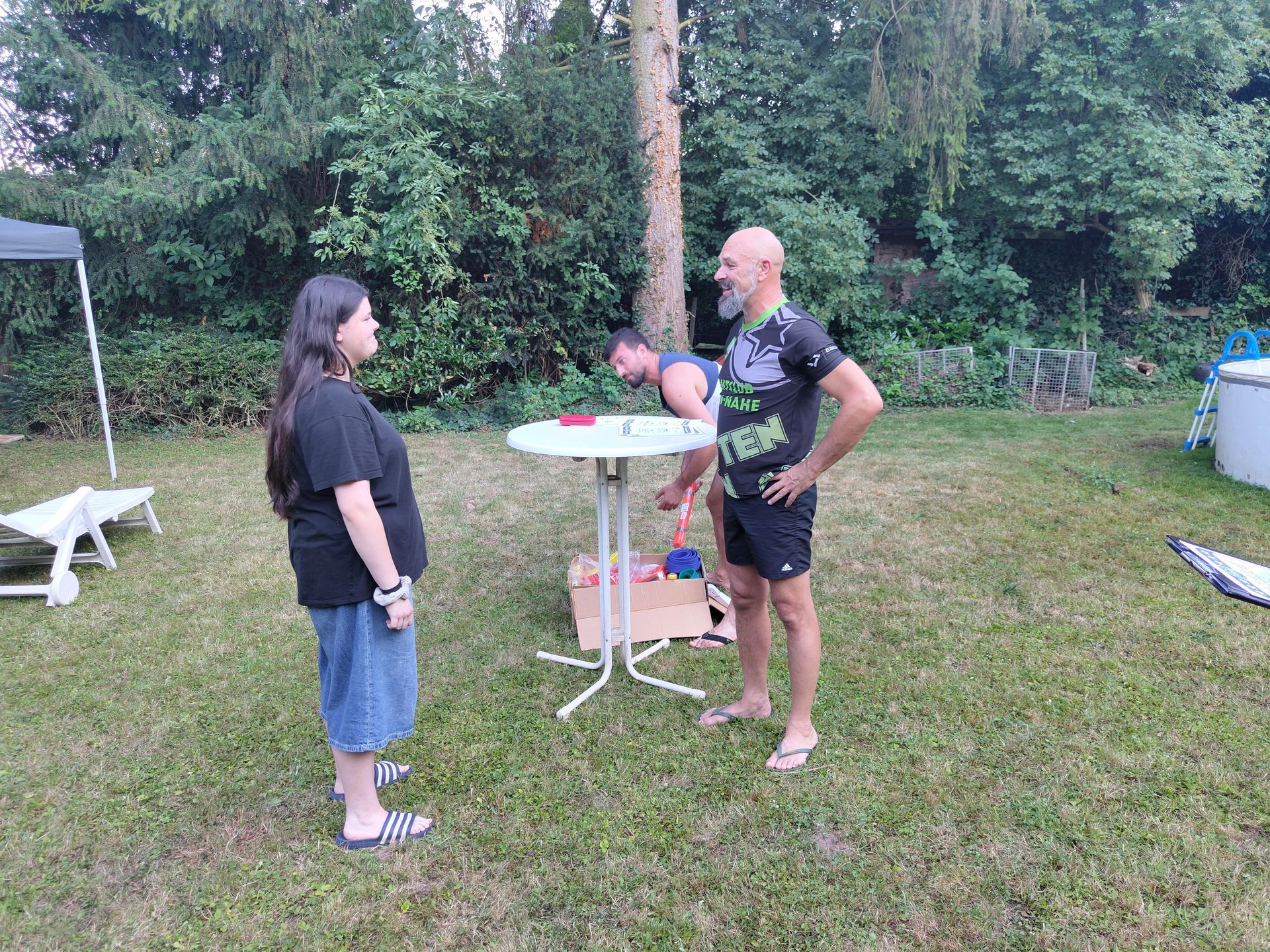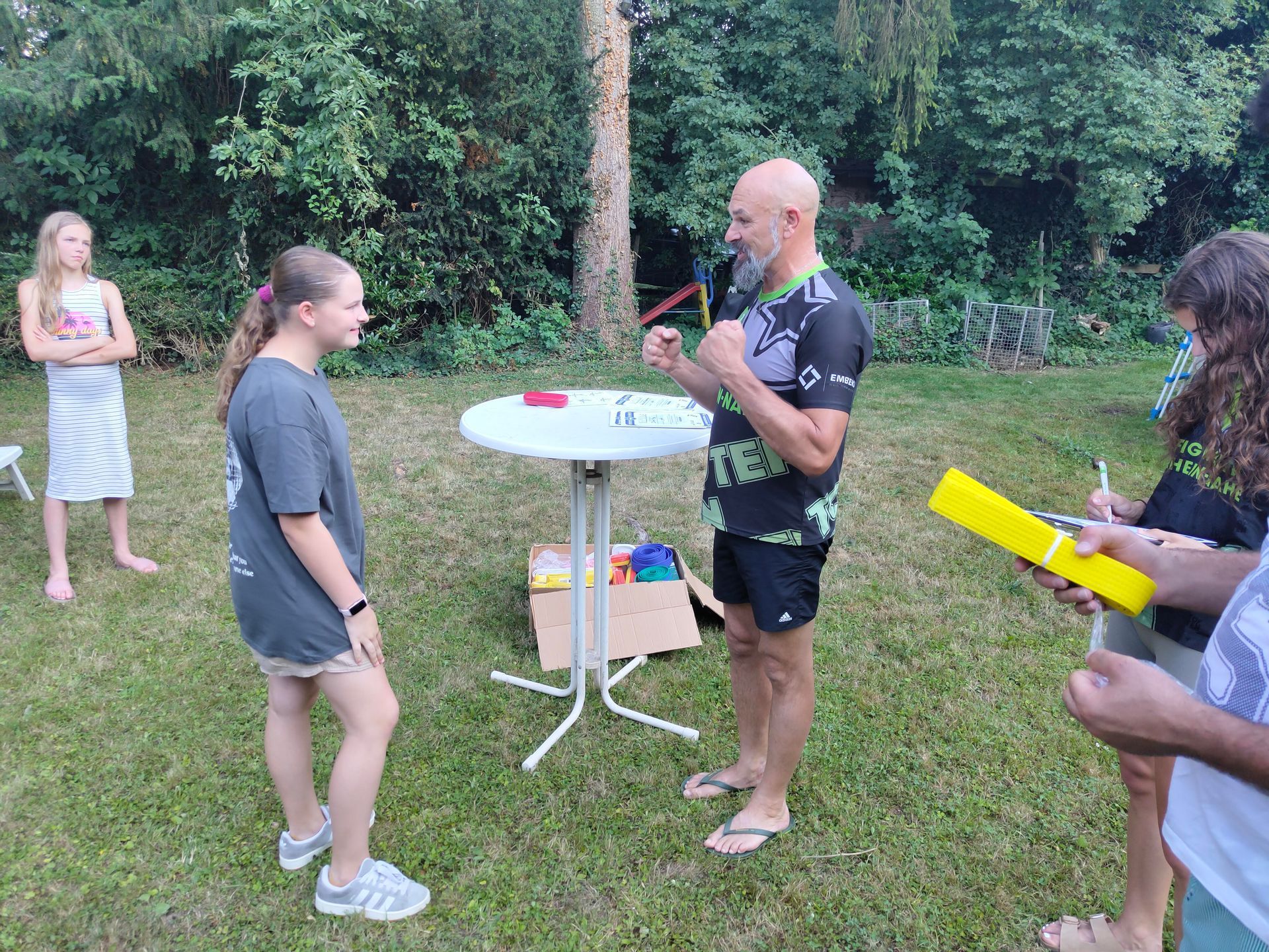 Die Verabschiedung in die Sommerferien wurde auch 2025 wieder mit einer coolen Grillparty in Dirks Garten gebührend gefeiert. Bei brütenden Temperaturen wurden die Gürtel an die Absolventen der, vor kurzem absolvierten Gürtelprüfung übergeben. Die Kids durften die Badehosen auspacken und sich in den Pool stürzen. Die Erwachsenen nutzten die Gartenparty für das ein oder andere Gespräch. Allen hat es Spaß gemacht und dank der reichlichen Salatspenden ist zusammen mit den Würstchen vom Grill auch jeder satt geworden. Jetzt heißt es wohlverdiente Sommerpause und nach den Ferien geht es mit Volldampf wieder voran. Glückwunsch an dieser Stelle nochmal an alle, die die Gürtelprüfung bestanden haben.