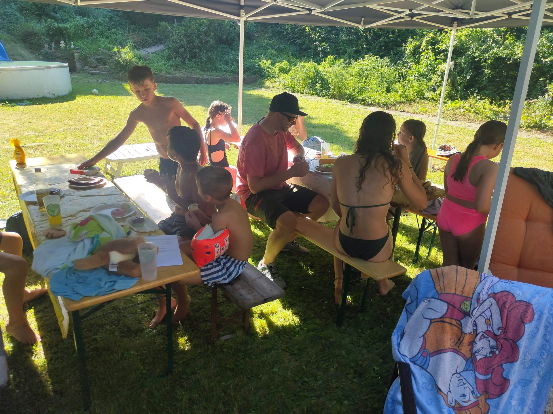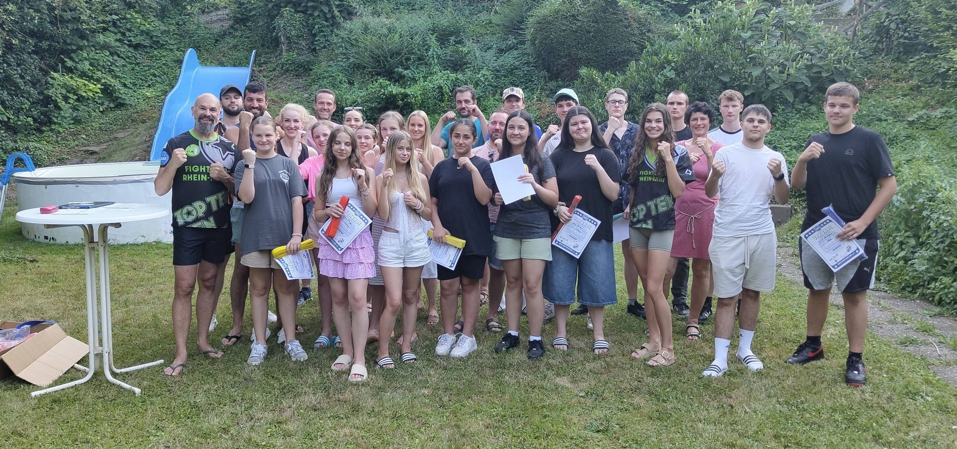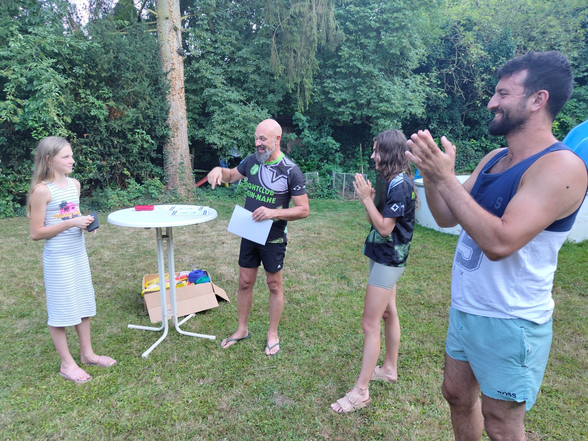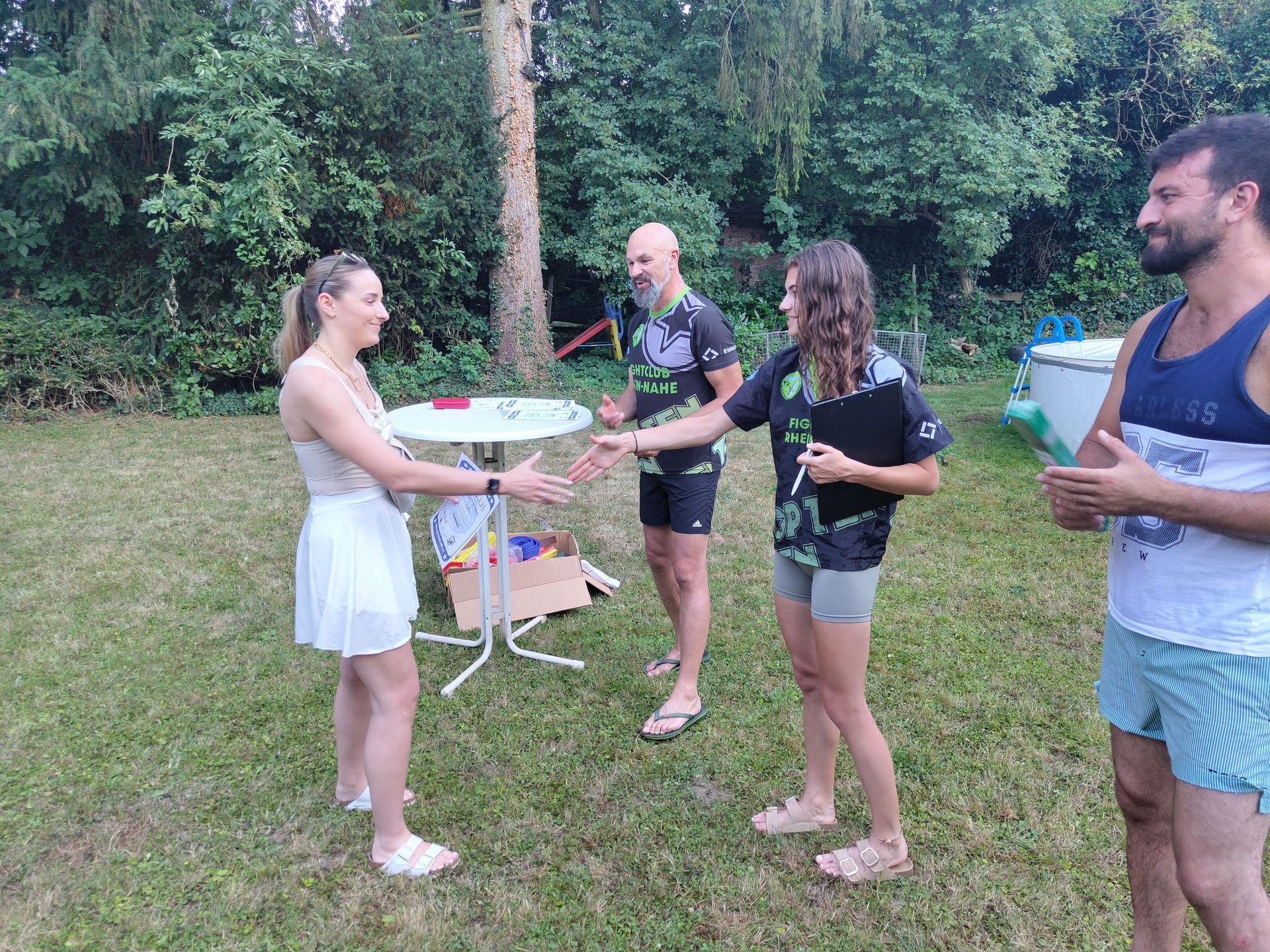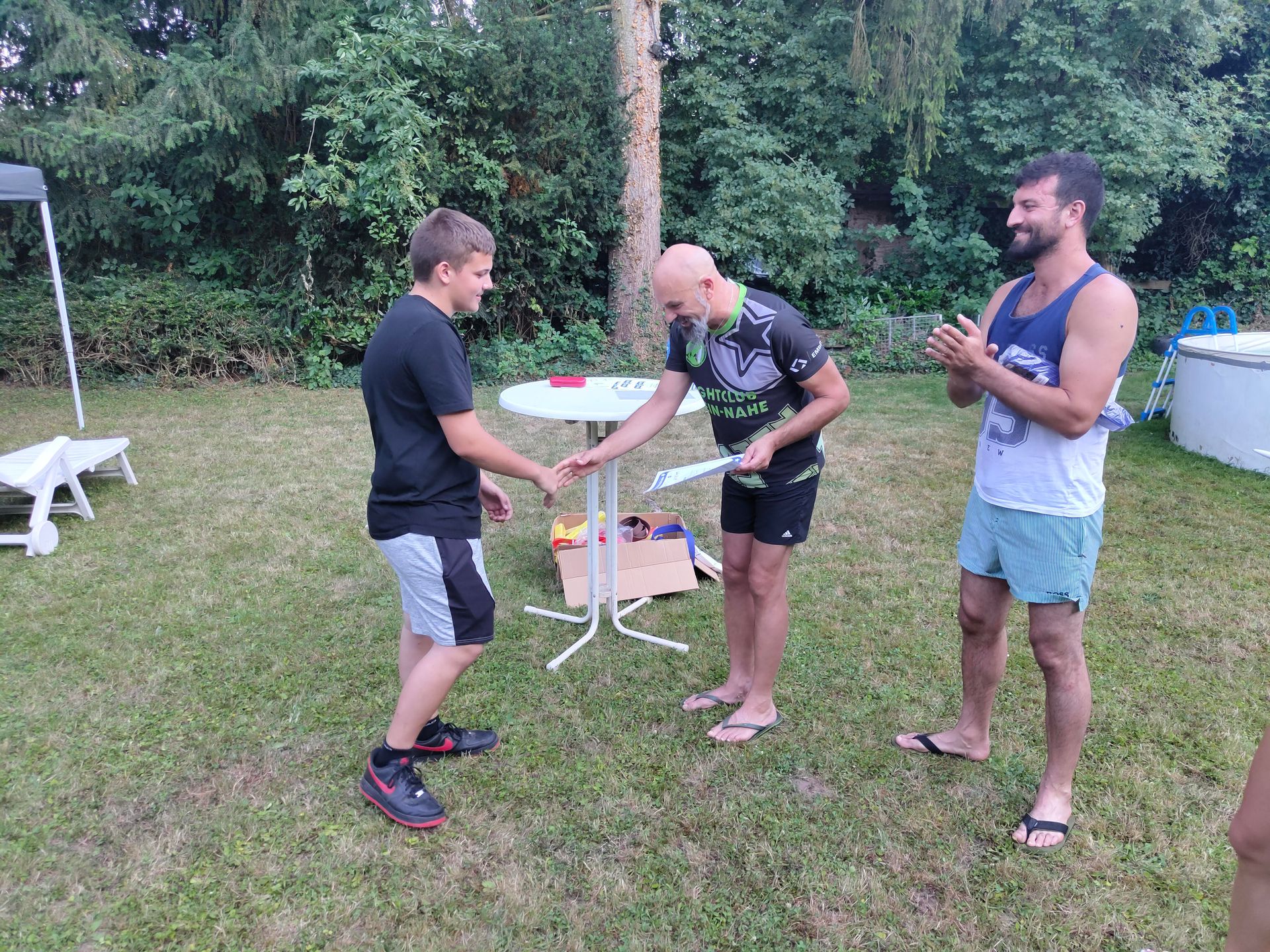 Die Verabschiedung in die Sommerferien wurde auch 2025 wieder mit einer coolen Grillparty in Dirks Garten gebührend gefeiert. Bei brütenden Temperaturen wurden die Gürtel an die Absolventen der, vor kurzem absolvierten Gürtelprüfung übergeben. Die Kids durften die Badehosen auspacken und sich in den Pool stürzen. Die Erwachsenen nutzten die Gartenparty für das ein oder andere Gespräch. Allen hat es Spaß gemacht und dank der reichlichen Salatspenden ist zusammen mit den Würstchen vom Grill auch jeder satt geworden. Jetzt heißt es wohlverdiente Sommerpause und nach den Ferien geht es mit Volldampf wieder voran. Glückwunsch an dieser Stelle nochmal an alle, die die Gürtelprüfung bestanden haben.