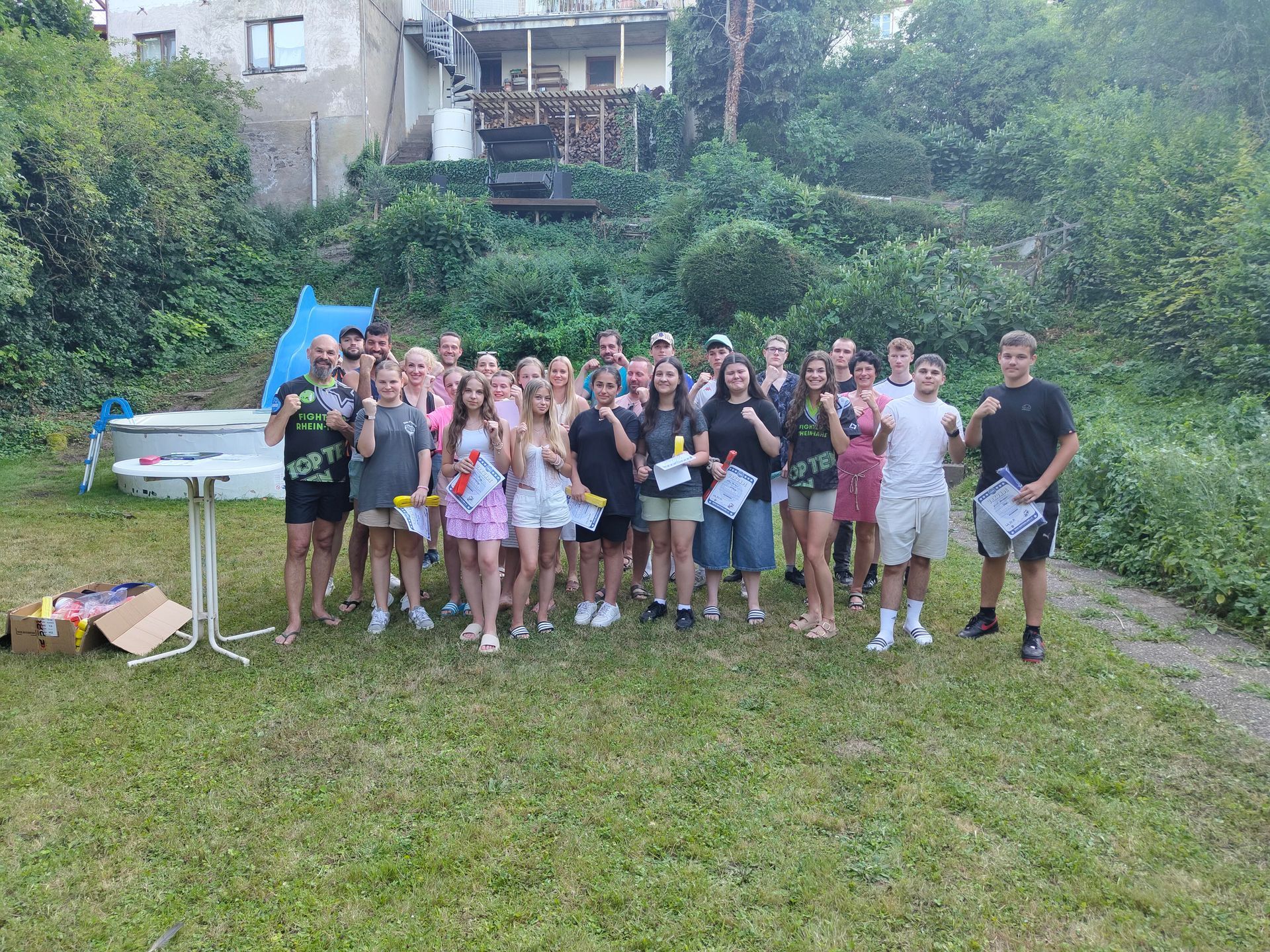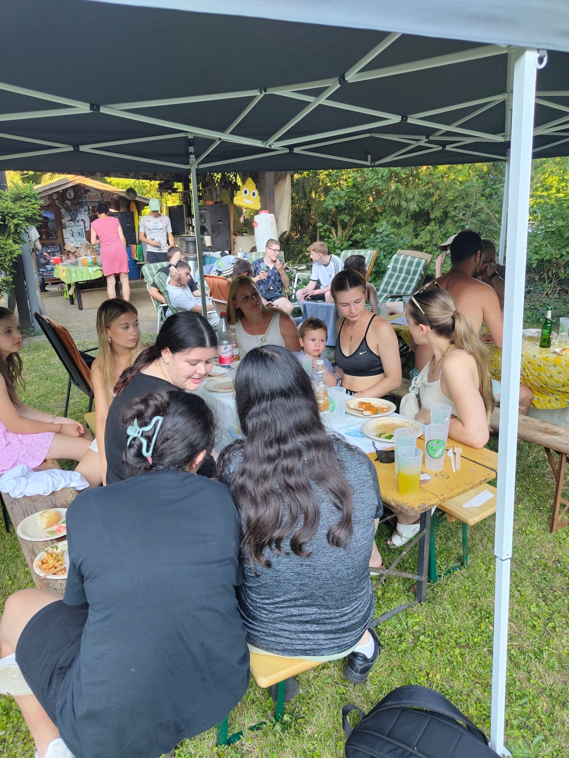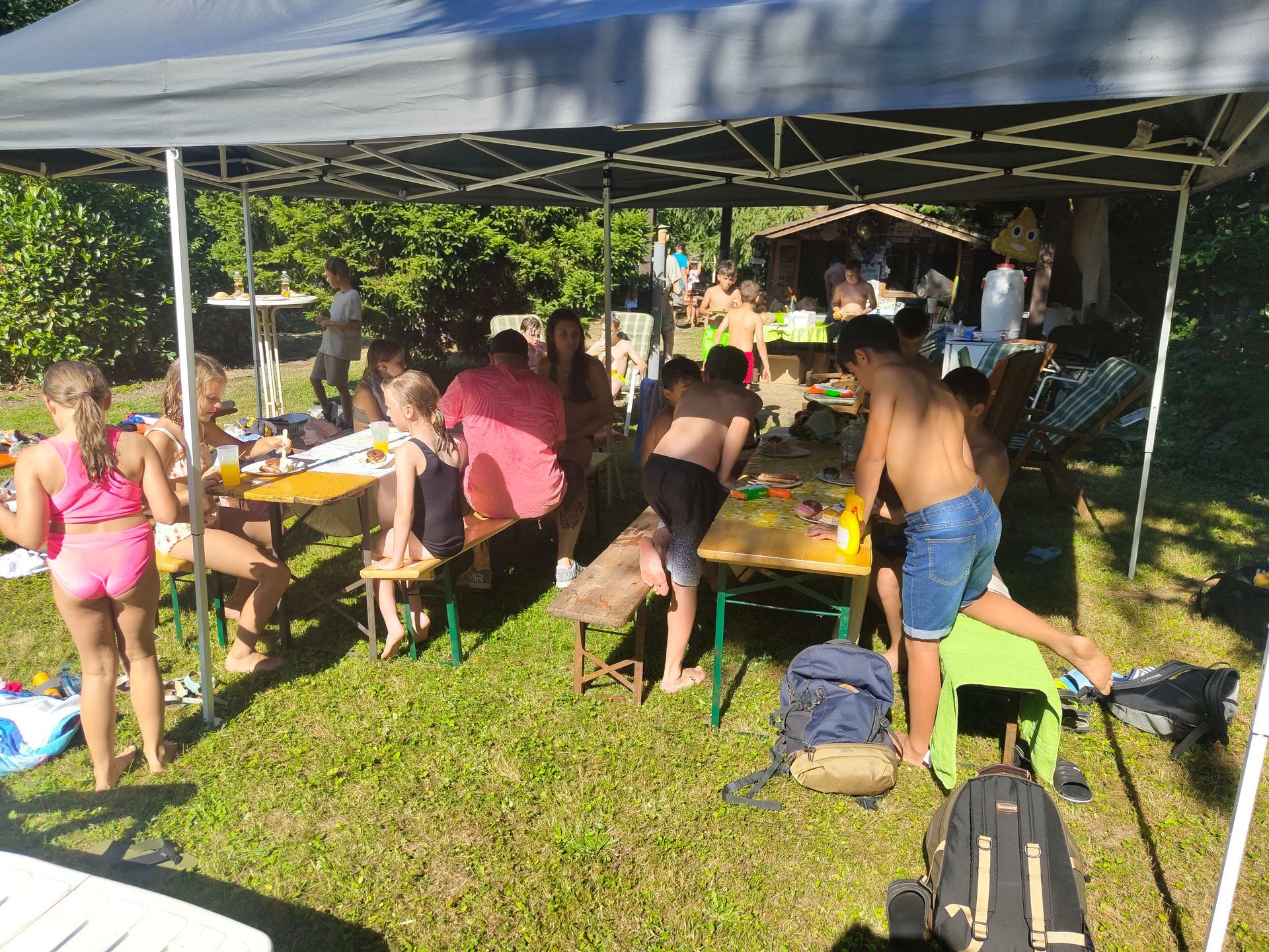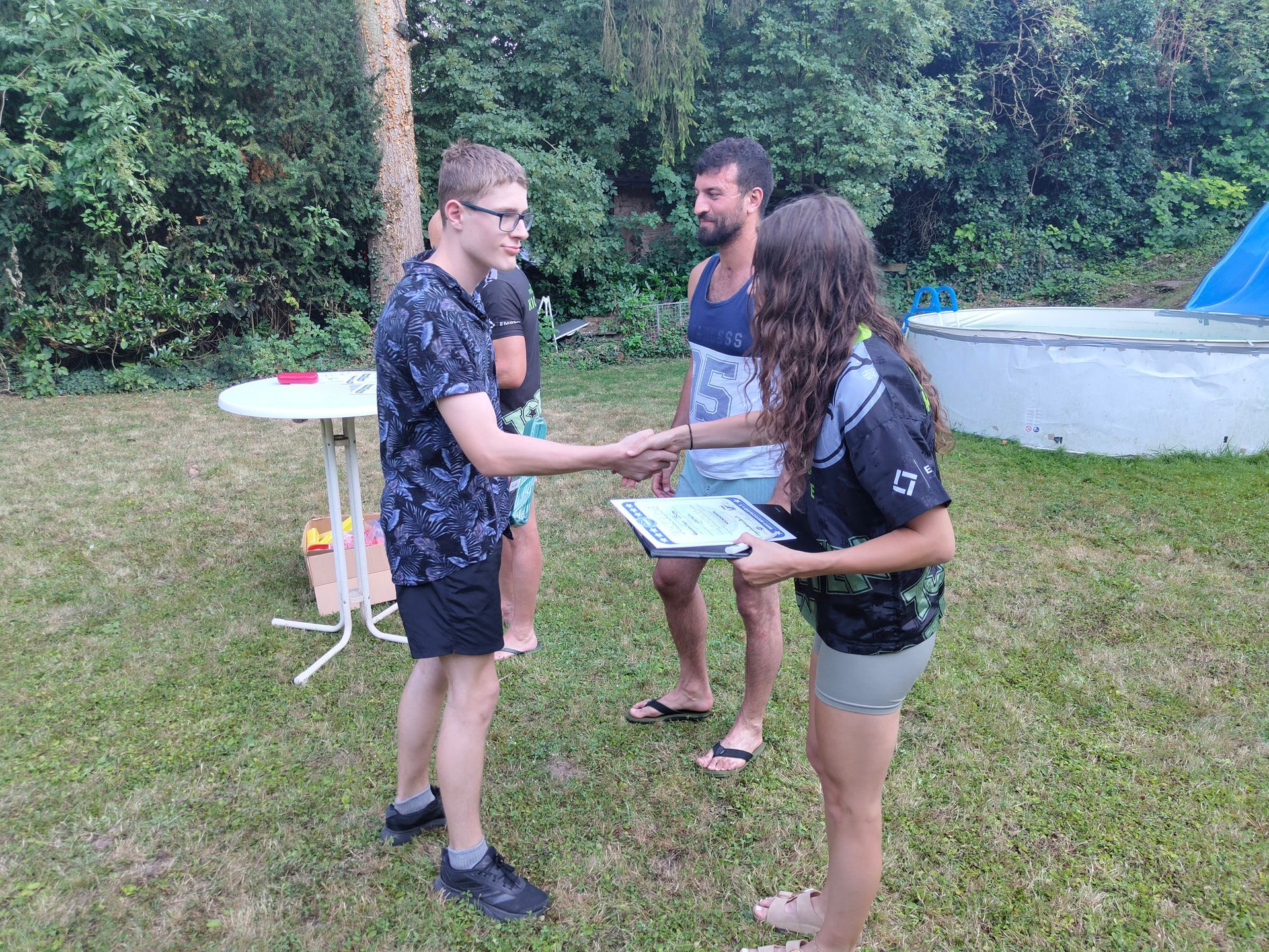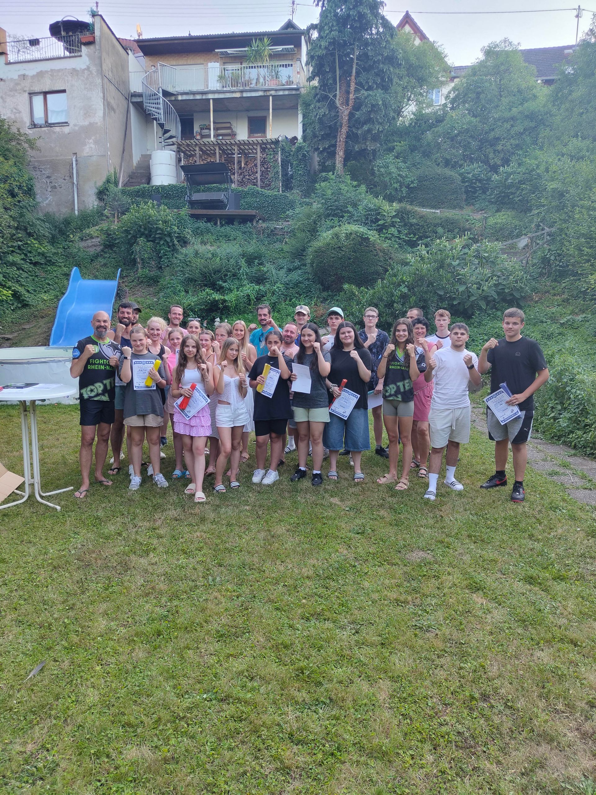 Die Verabschiedung in die Sommerferien wurde auch 2025 wieder mit einer coolen Grillparty in Dirks Garten gebührend gefeiert. Bei brütenden Temperaturen wurden die Gürtel an die Absolventen der, vor kurzem absolvierten Gürtelprüfung übergeben. Die Kids durften die Badehosen auspacken und sich in den Pool stürzen. Die Erwachsenen nutzten die Gartenparty für das ein oder andere Gespräch. Allen hat es Spaß gemacht und dank der reichlichen Salatspenden ist zusammen mit den Würstchen vom Grill auch jeder satt geworden. Jetzt heißt es wohlverdiente Sommerpause und nach den Ferien geht es mit Volldampf wieder voran. Glückwunsch an dieser Stelle nochmal an alle, die die Gürtelprüfung bestanden haben.