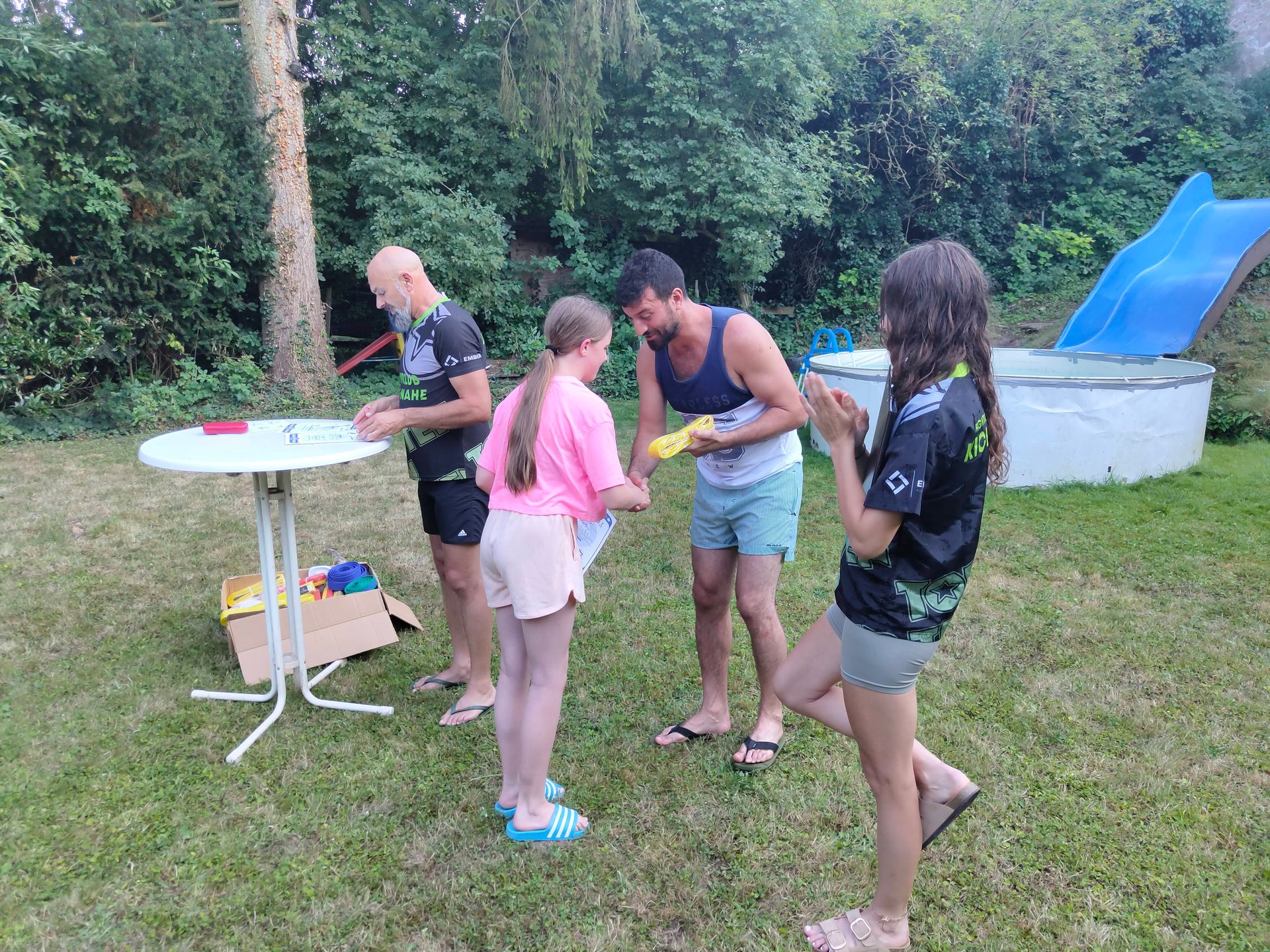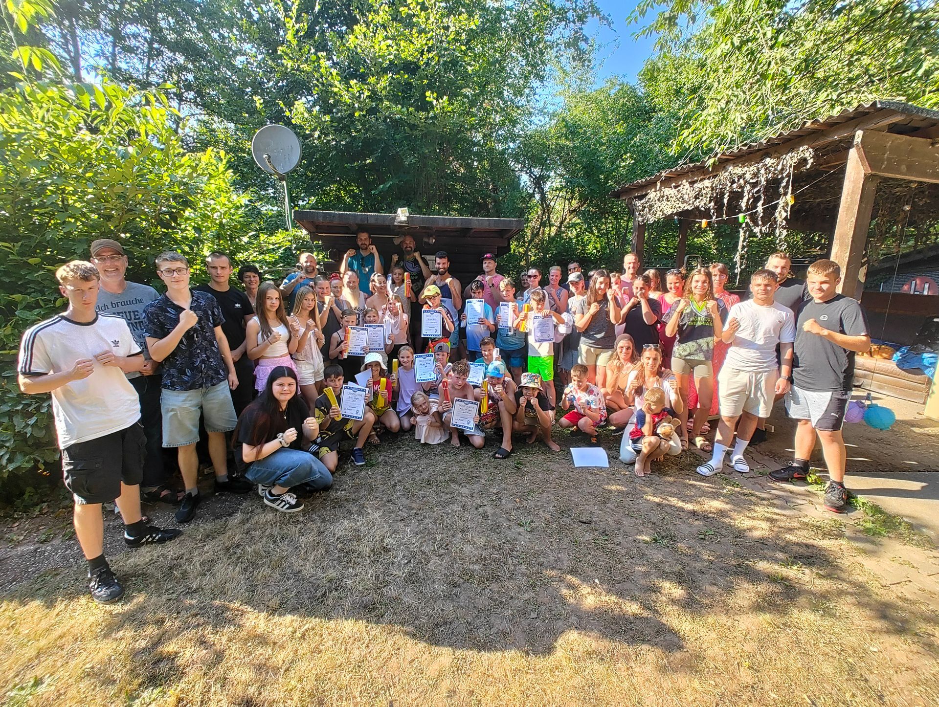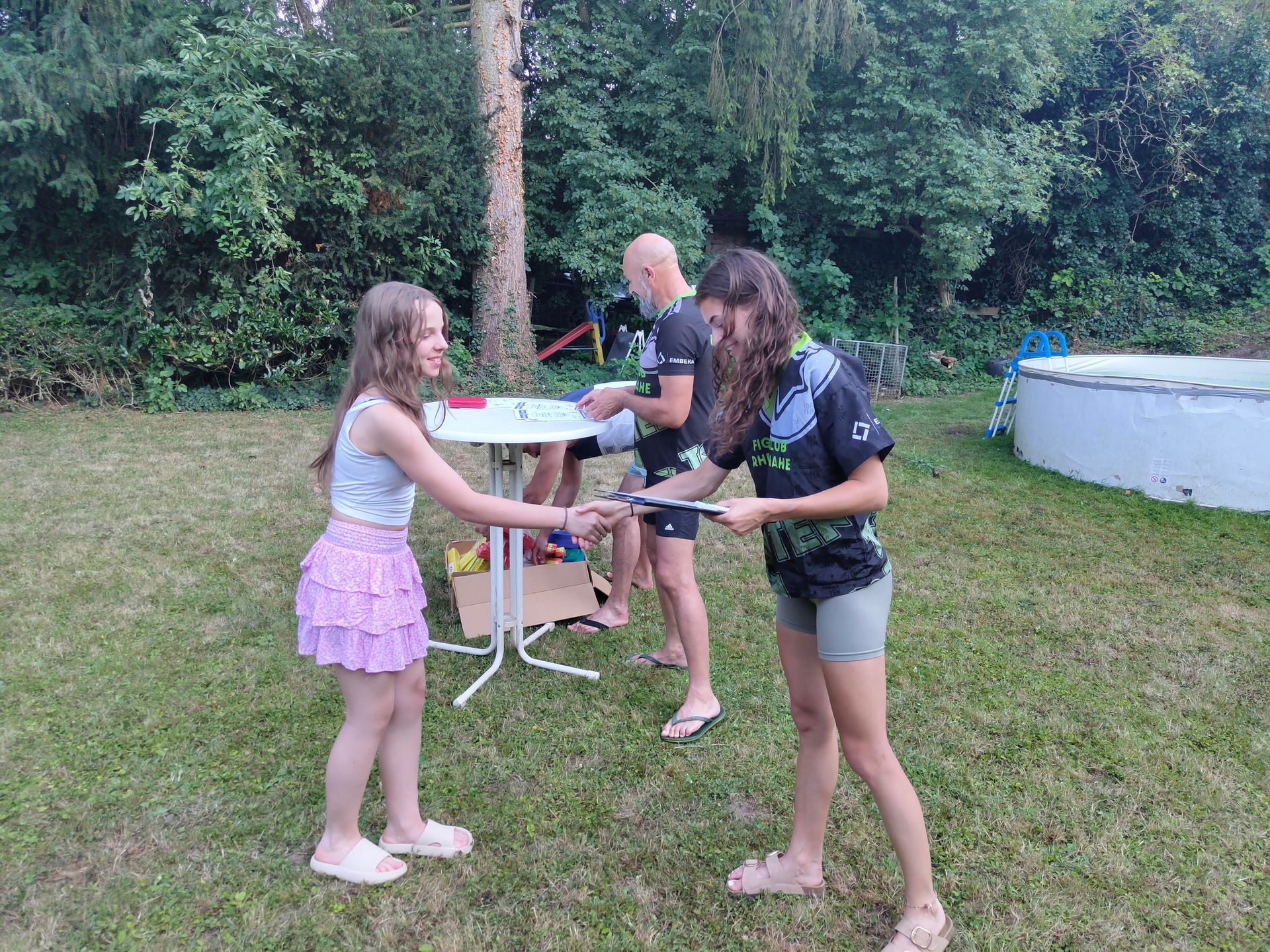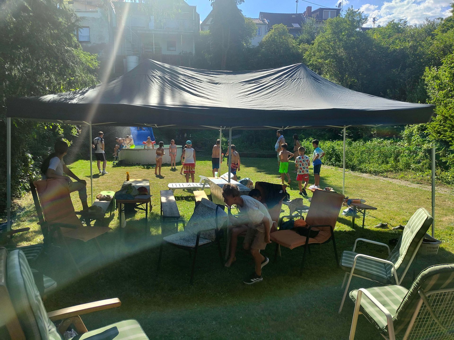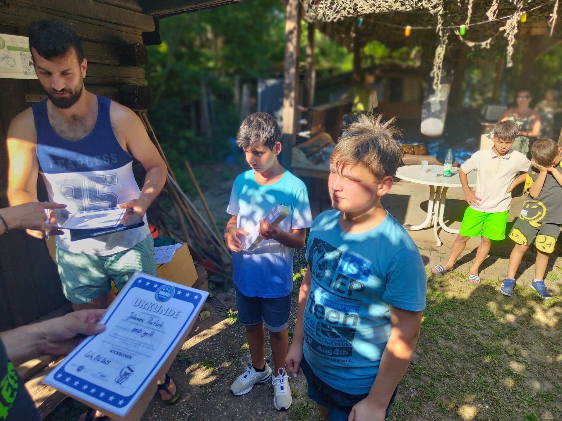 Die Verabschiedung in die Sommerferien wurde auch 2025 wieder mit einer coolen Grillparty in Dirks Garten gebührend gefeiert. Bei brütenden Temperaturen wurden die Gürtel an die Absolventen der, vor kurzem absolvierten Gürtelprüfung übergeben. Die Kids durften die Badehosen auspacken und sich in den Pool stürzen. Die Erwachsenen nutzten die Gartenparty für das ein oder andere Gespräch. Allen hat es Spaß gemacht und dank der reichlichen Salatspenden ist zusammen mit den Würstchen vom Grill auch jeder satt geworden. Jetzt heißt es wohlverdiente Sommerpause und nach den Ferien geht es mit Volldampf wieder voran. Glückwunsch an dieser Stelle nochmal an alle, die die Gürtelprüfung bestanden haben.