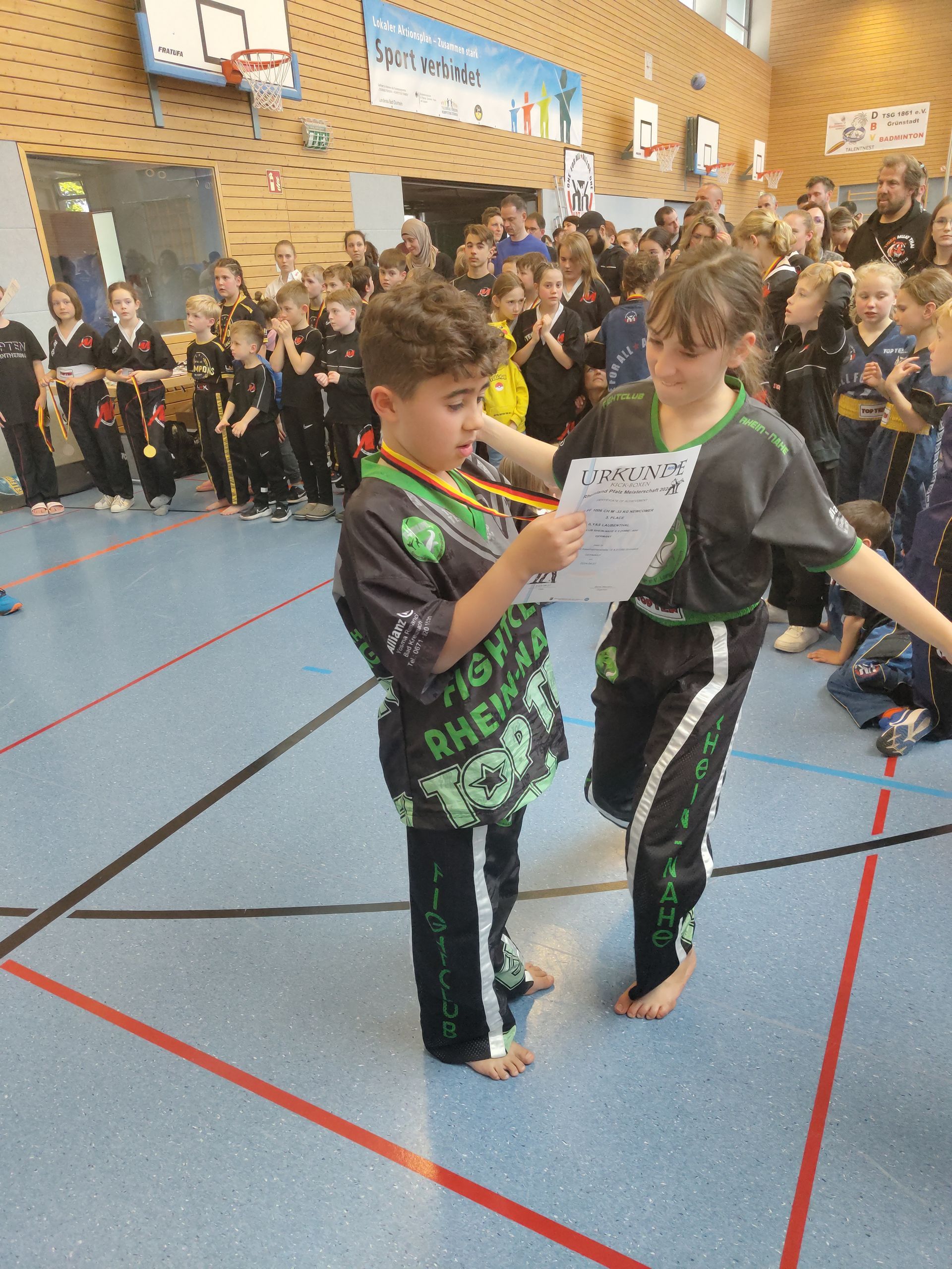 Jetzt wollten es auch die Kämpfer Deniz Ciftci aus Simmern und Lars Müller aus Bretzenheim in der Disziplin Leichtkontakt wissen. Deniz lieferte sich packende Duelle gegen seine viel größeren Gegner, erkämpfte sich aber souverän und verdient den Meister-Titel. Der älteste Teilnehmer des SC mit 31 Jahren war Lars. Er beeindruckte seinen Trainer im Finale, musste sich aber leider mit dem Titel des Vizemeisters aufgrund eines Kampfrichterfehlers begnügen. Er nahm es aber sportlich und beide Kämpfer lagen sich nach dem kräfteraubenden Fight in den Armen. Auf dem Weg nach Hause hatten damit alle Teilnehmer eine Trophäe im Gepäck und somit sind alle bis auf die Newcomer für die Deutsche Meisterschaft in Hamburg qualifiziert. Als Kampfrichter bewerteten Cagdas Kaya und Caner Demir vom SC die Kämpfe auf der Meisterschaft. Trainerduo Theresa und Dirk Pekrul waren mit der Leistung ihres Teams zufrieden und hoffen nun auch auf weitere Erfolge der qualifizierten Kämpfer bei der Deutschen Meisterschaft in Hamburg.