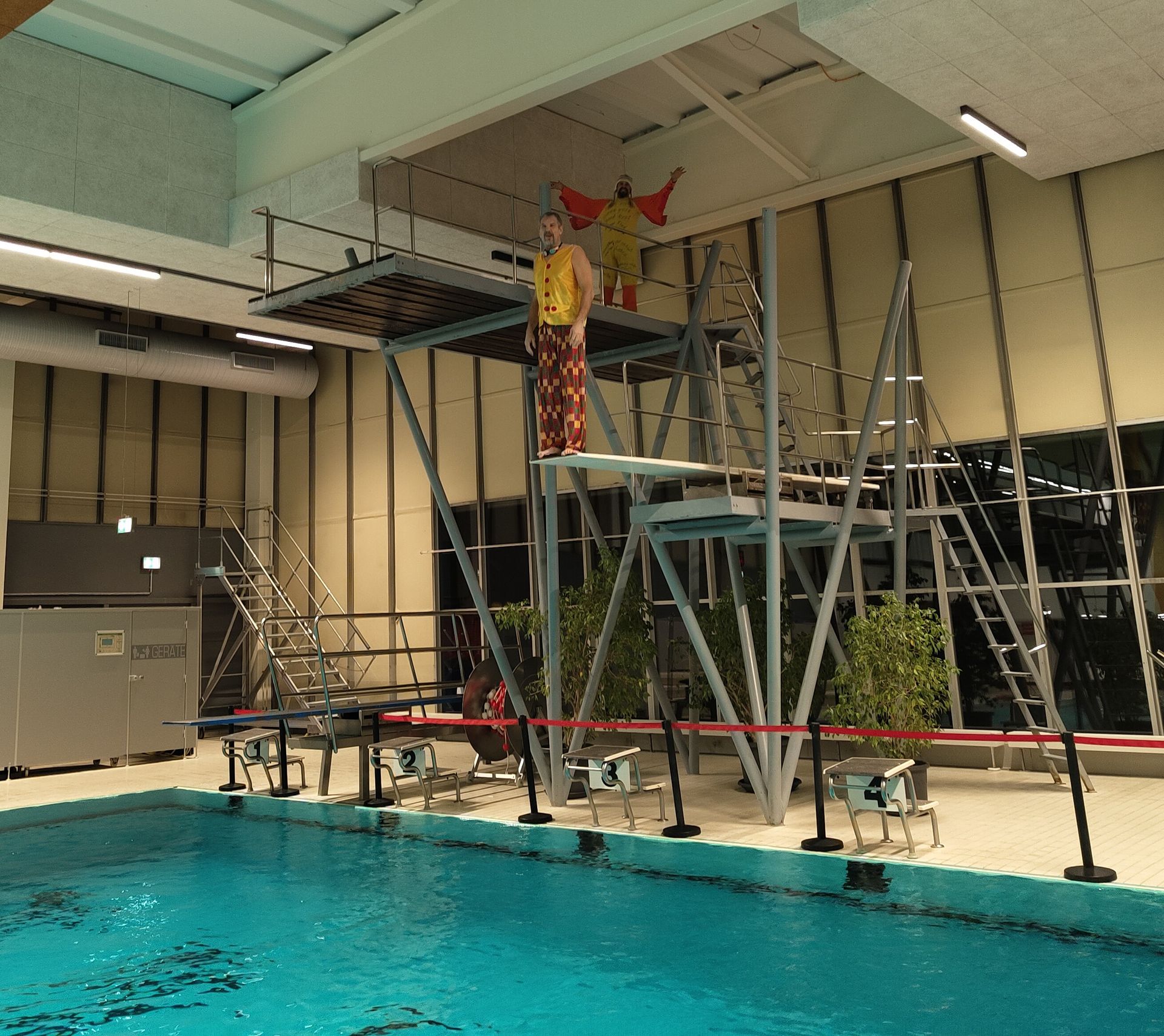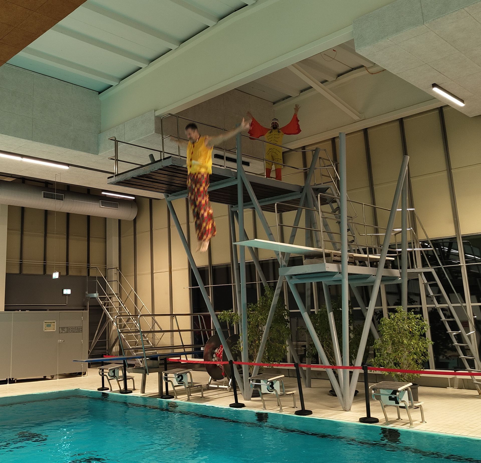 Angeführt von unserem Coach Christian, schlüpften wir in alles, was lustig und bunt war: von Gockel über Clown bis hin zu exotischen Tieren. Die Schwimmhalle war ein farbenfrohes Spektakel!